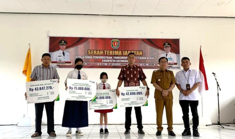JEJAKKALTENG.COM, Kasongan – Bupati Katingan Sakariyas, SE menyerahkan santunan Jaminan Kematian dan beasiswa BPJS Ketenagakerjaan kepada penerima manfaat. Santunan tersebut diterima langsung oleh empat ahli waris, saat acara di Aula Dinas Perindustrian, Transmigrasi dan Tenaga Kerja Kabupaten Katingan, baru-baru ini.