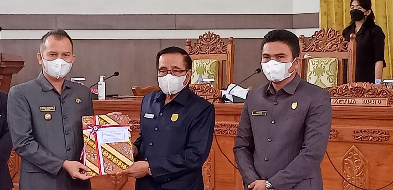 Bupati Gumas, Jaya S Monong, sedang menerima dari Ketua DPRD Gumas Akerman Sahidar terkait hasil kesepakatan APBD Perubahan di gedung dewan setempat, Selasa (30/8/2022). FOTO :CP/JK