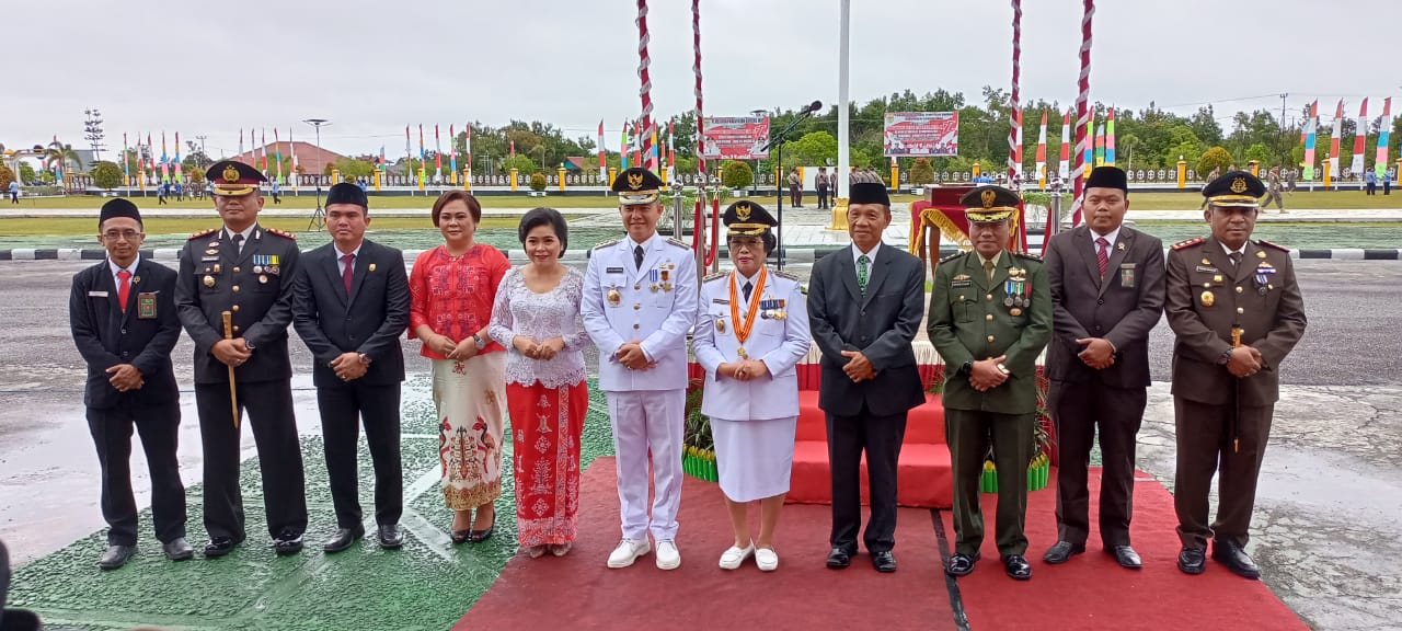 Bupati Gumas, Jaya S Monong, bersama forkopimda tengah berfoto bersama tanda kebersamaan terjalin usai apel pengibaran bendera di depan kantor bupati setempat, Rabu (17/8/2022). Foto : CP/JK