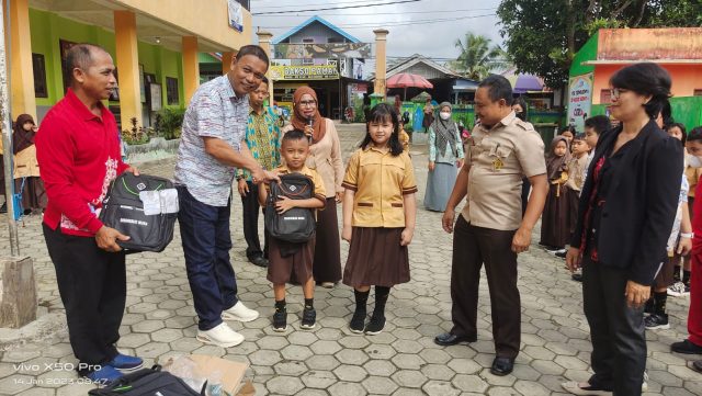 Kepala Dinas Pendidikan dan Kebudayaan Kabupaten Murung Raya Ferdinand Wijaya, saat menyerahkan tas secara gratis bagi siswa berprestasi akademik di SDN Beriwit 4, Sabtu (14/1/2022).