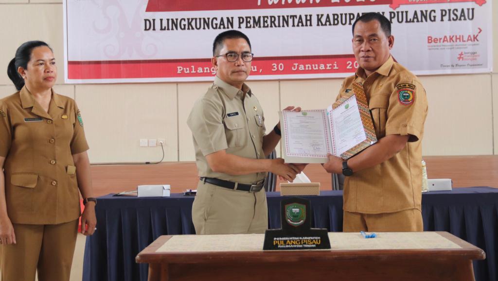 Membacakan sambutan Bupati Pulang Pisau Pudjirustaty Narang, Sekda Pulang Pisau Tony Harisinta mengatakan bahwa penandatanganan perjanjian kerja merupakan tindak lanjut dari Peraturan Menteri PAN-RB Nomor 053 tahun 2014 tentang petunjuk teknis perjanjian kinerja, pelaporan kinerja, dan tata cara review atas laporan kinerja instansi pemerintah.