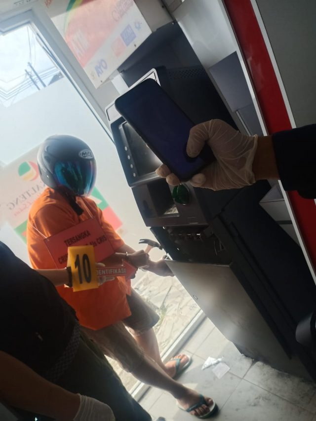 JEJAKKALTENG.COM, PALANGKA RAYA – 15 adegan diperagakan pelaku pembobolan Anjungan Tunai Mandiri (ATM) saat kepolisian dari Satreskrim Polresta Palangka Raya, menggelar rekontruksi, Selasa (12/7/2022) siang.