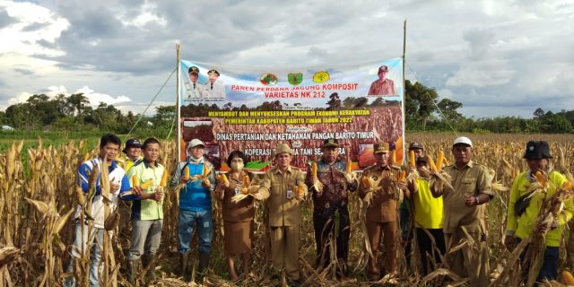FOTO : Kadistan Bartim, Trikorianto bersama Camat Dusun Tengah, Prismayandi, ketua Komisi II DPRD Bartim H Wahyudinnor saat panen perdana jagung komposit pakan ternak, kemitraan Dinas Pertanian Bartim dengan Koperasi Bersama Tani Sejahtera, belum lama ini.
