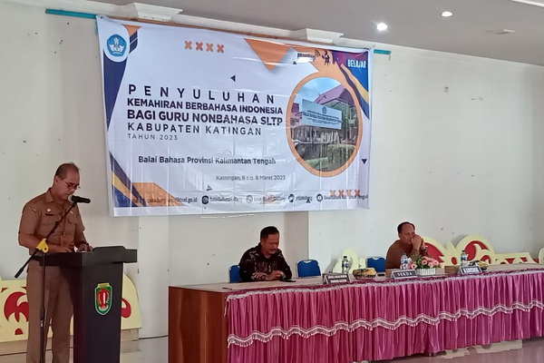 JEJAKKALTENG.COM, Kasongan – Sekretaris Daerah (Sekda) Kabupaten Katingan, Pransang, S.Sos membuka Penyuluhan Kemahiran Berbahasa Indonesia bagi Guru Non Bahasa Indonesia SLTP Tahun 2023 di Kabupaten Katingan, Senin (06/03/2023). Kegiatan yang diselenggarakan pihak Balai Bahasa Provinsi Kalimantan Tengah ini dilaksanakan di Aula Kantor Dinas Pendidikan Kabupaten Katingan.