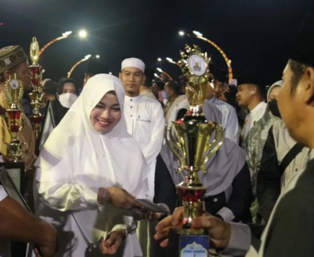 JEJAKKALTENG.COM, Sampit – Wakil Bupati Kabupaten Kotawaringin Timur (Kotim), Irawati, menyerahkan hadiah kepada para pemenang lomba takbiran, di sela-sela kegiatan Kotim Bershalawat di Ikon Kota Sampit Terowongan Nur Mentaya, Minggu (30/4/2023) malam.