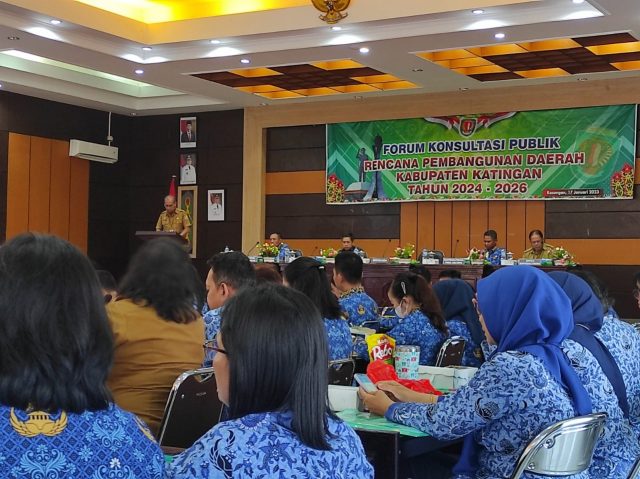 JEJAKKALTENG.COM, Kasongan – Sekda Katingan Pransang membuka Acara Forum Konsultasi Publik Rencana Pembangunan Daerah (RPD) Kabupaten Katingan Tahun 2024 – 2026, di Aula Lantai Dua Kantor Bappeltibang Katingan, Selasa (17/1/2023).